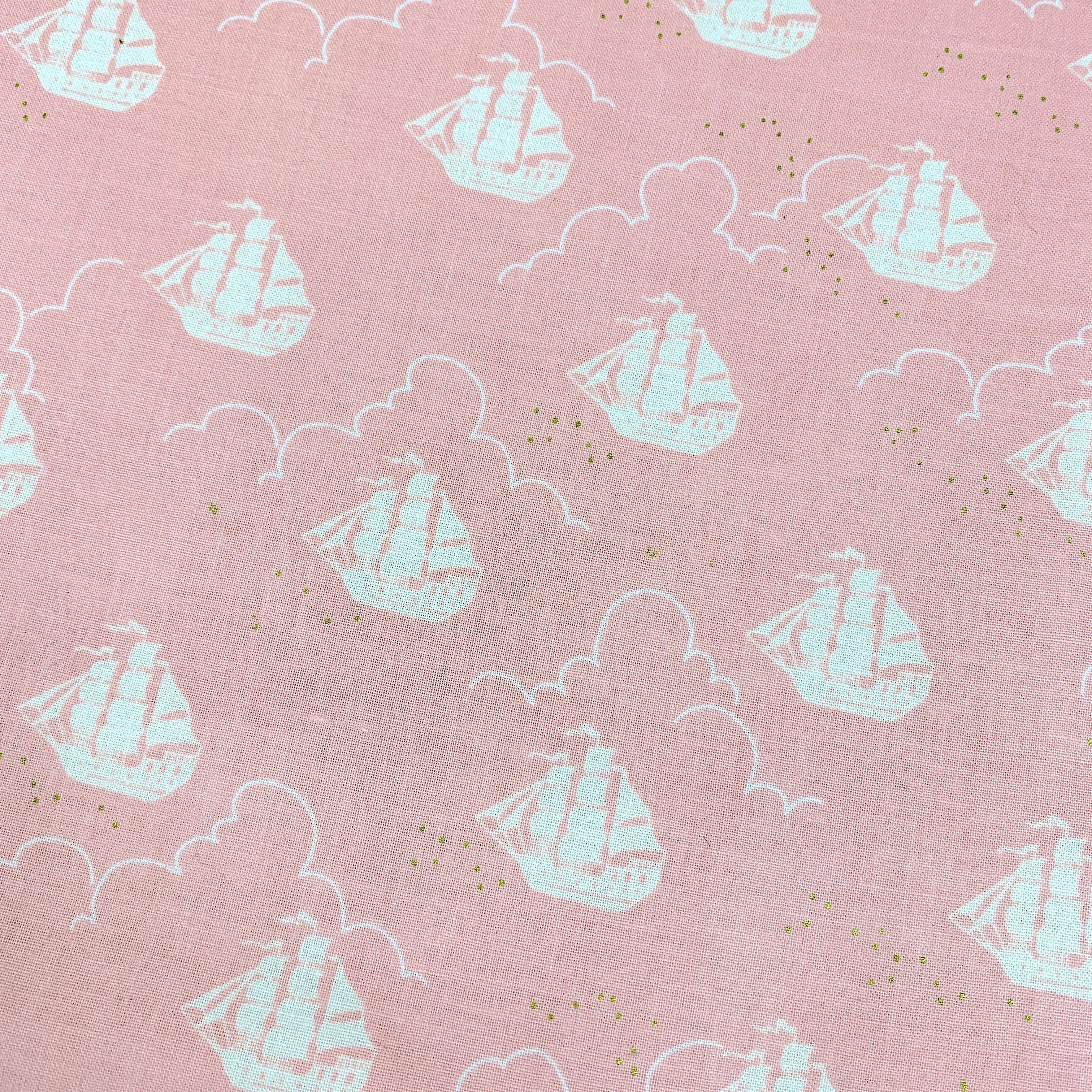 100% Cotton Patterned - White sailboat on pink background