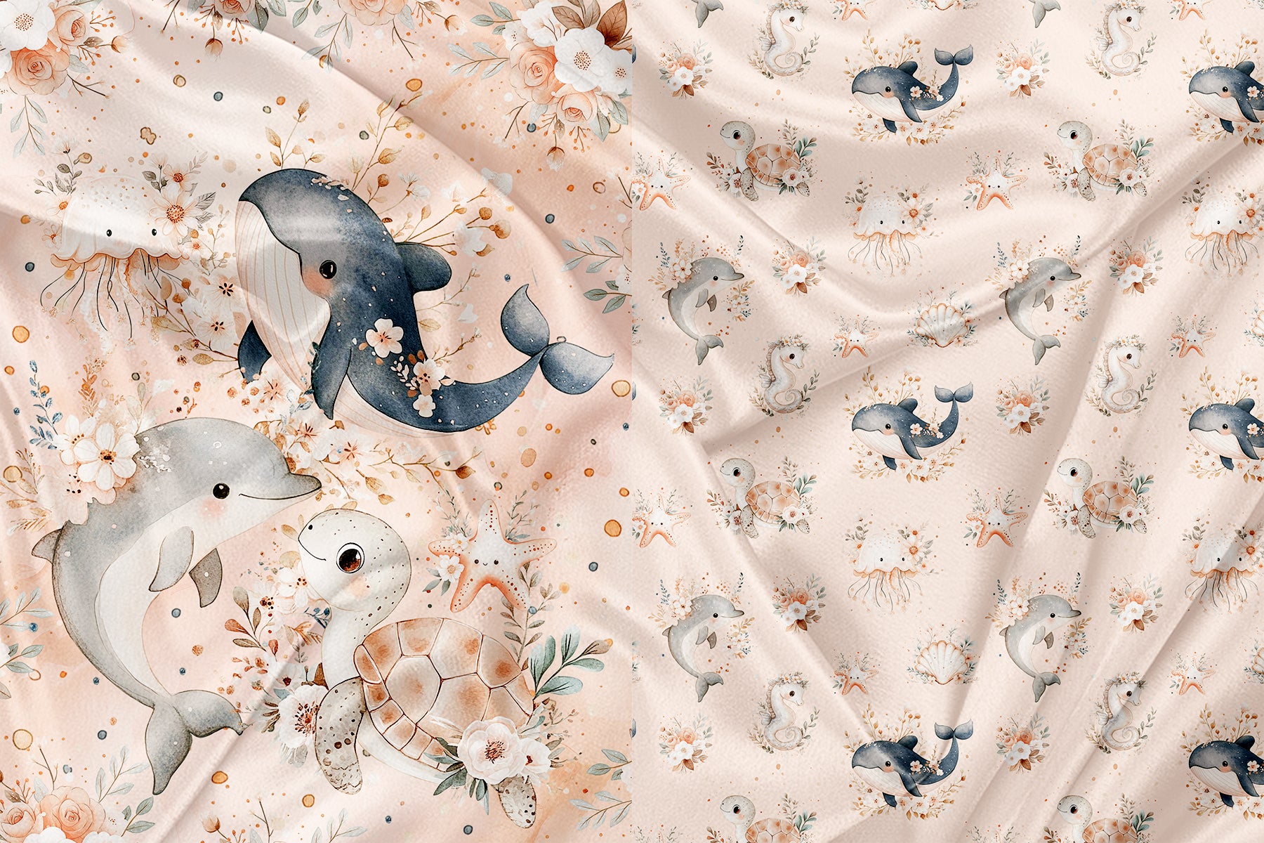 Watercolor floral whales and fish