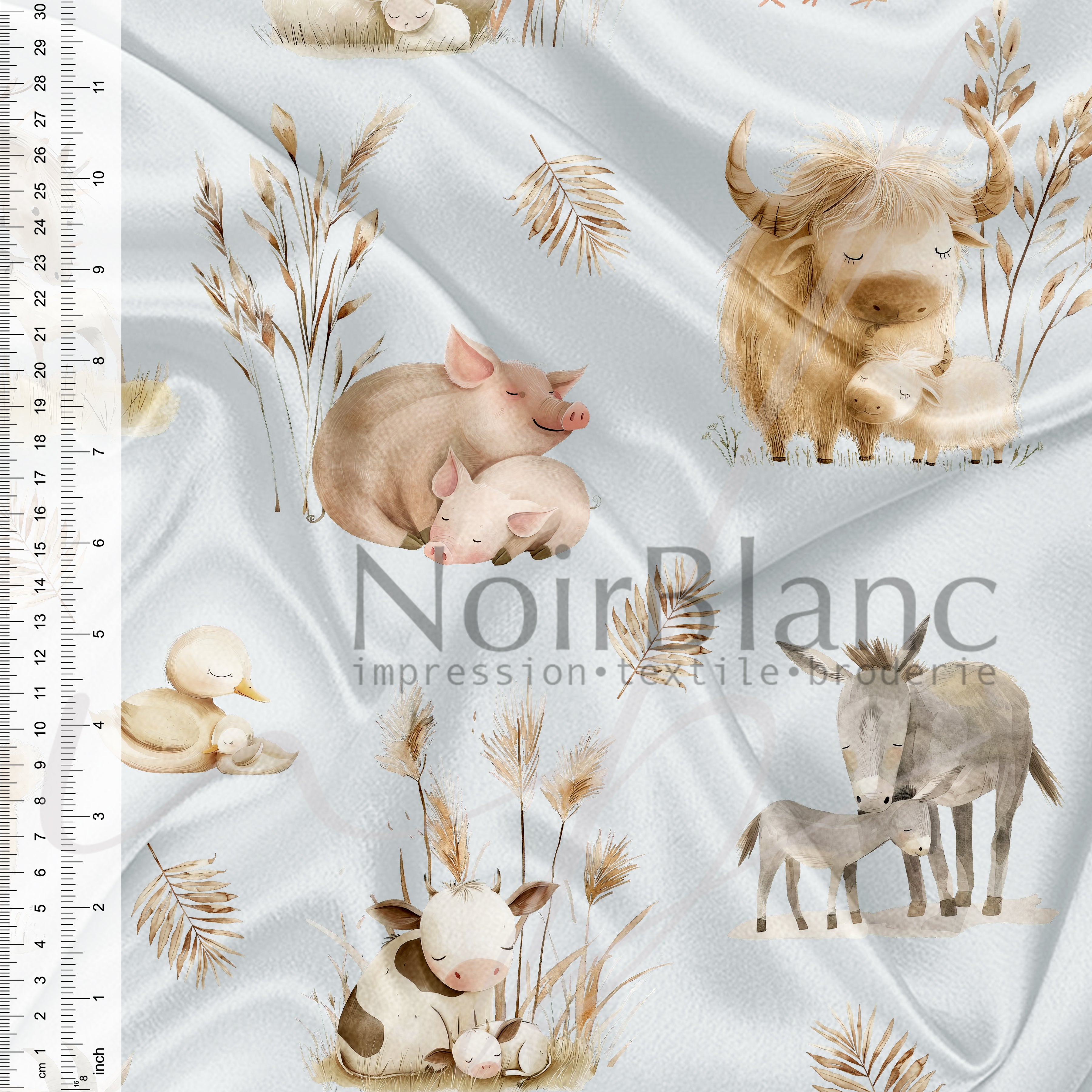 *** La largeur de nos tissus peut varier entre 57 et 60 pouces de large. Par conséquent, la largeur de la zone d'impression variera aussi. TOUT défaut à l'intérieur de la largeur d'impression mais à moins de 1 pouce du bord est considéré comme acceptable et ne sera en aucun cas considéré comme étant défectueux. Par exemple, un tissu où 60 pouces est imprimé, nous nous assurons que 58 pouces est sans défaut. De plus, tout léger défaut d'impression n'excédant pas 1 pouce ou sur le verso du tissu seront jugés comme acceptables. Nous imprimons sur plusieurs imprimantes afin de vous offrir un service d'impression rapide, il peut y avoir une différence de couleurs d'une imprimante à l'autre, d'une fibre à l'autre particulièrement entre les fibres naturelles et le polyester. Nous vous suggérons fortement de toujours commander suffisamment d'un même tissu dans une même commande pour pouvoir finaliser votre projet. ***